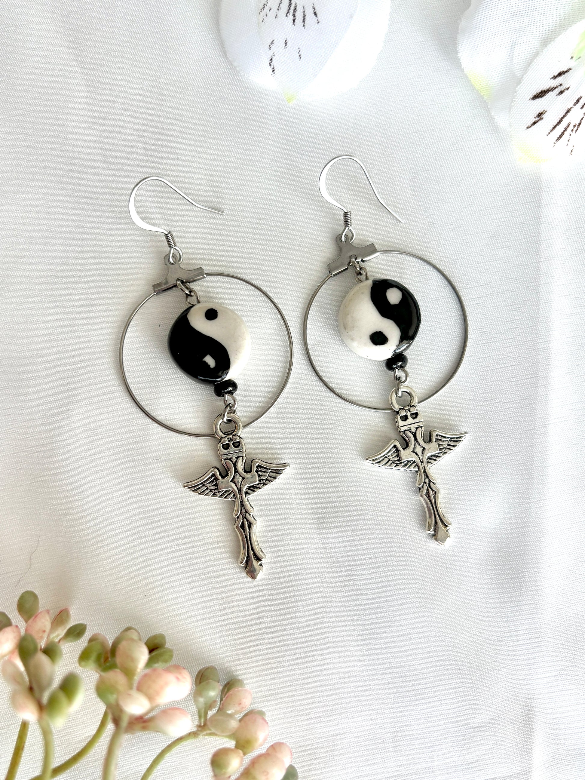 These earrings are made with upcycled ceramic ying-yang beads, pewter sword charms, stainless steel hoops, and stainless steel hardware and earring wire