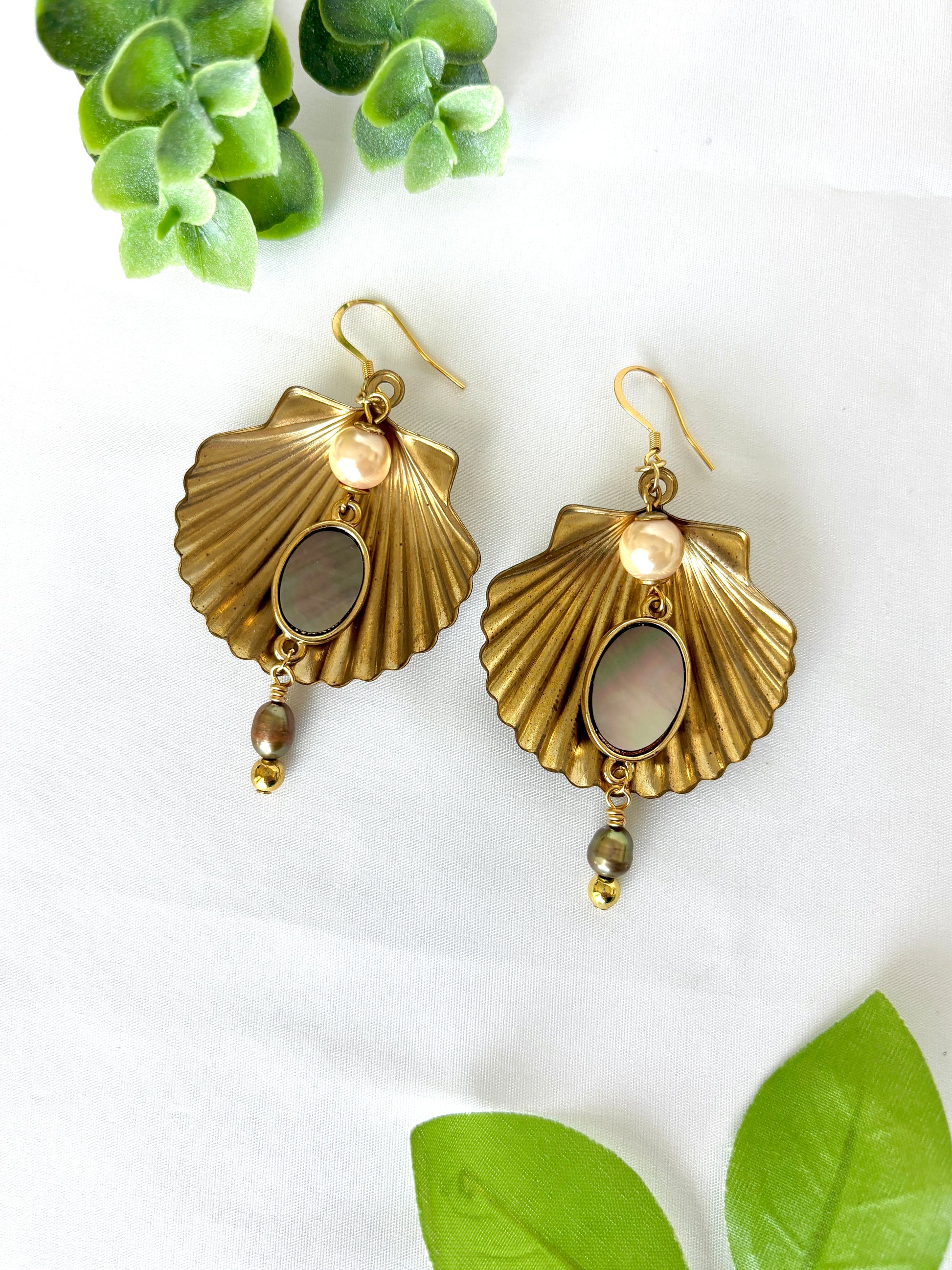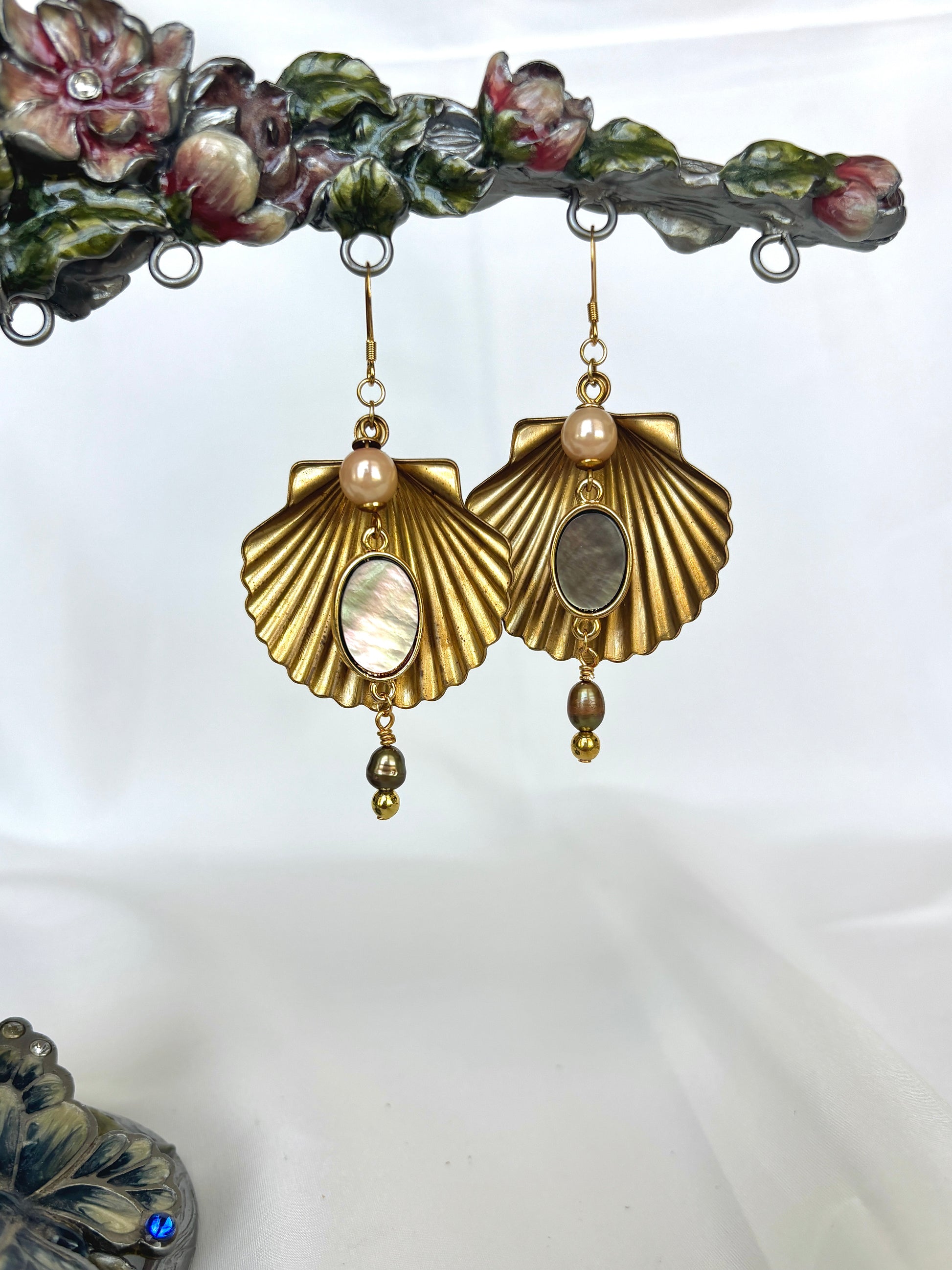 These earrings are made with upcycled vintage 1970's shell charms, glass pearl beads, freshwater pearl beads, mother of pearl gold tone connectors, hematite beads, and 18k stainless steel hardware and earring wire