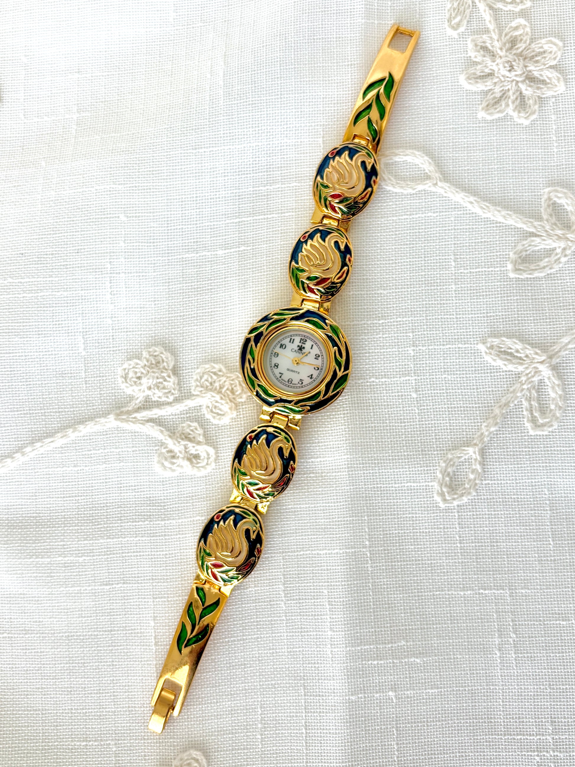 Cannes Vintage Enamel Gold Tone Swan Motif Band Quartz Watch