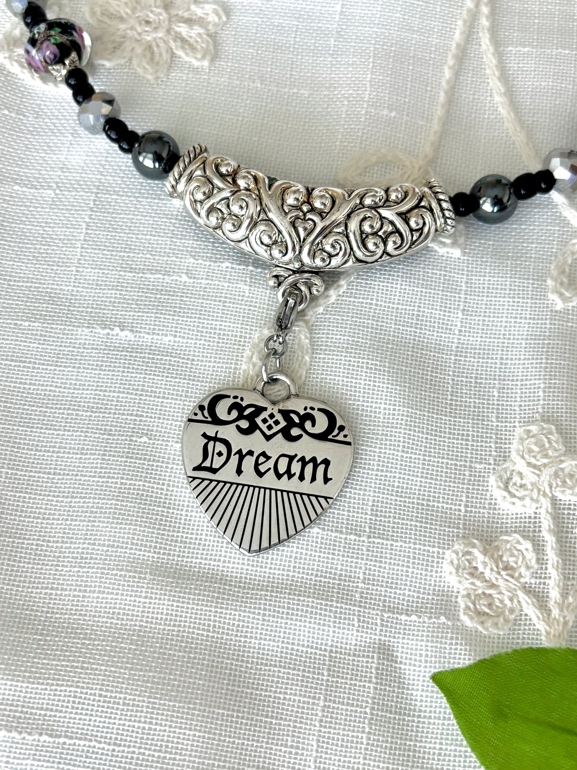 This necklace is made with an upcycled reversible Brighton pendant, silver tone center connector, lampwork glass beads, black seed beads, czech glass beads, hematite beads, and stainless steel and silver tone chain and hardware