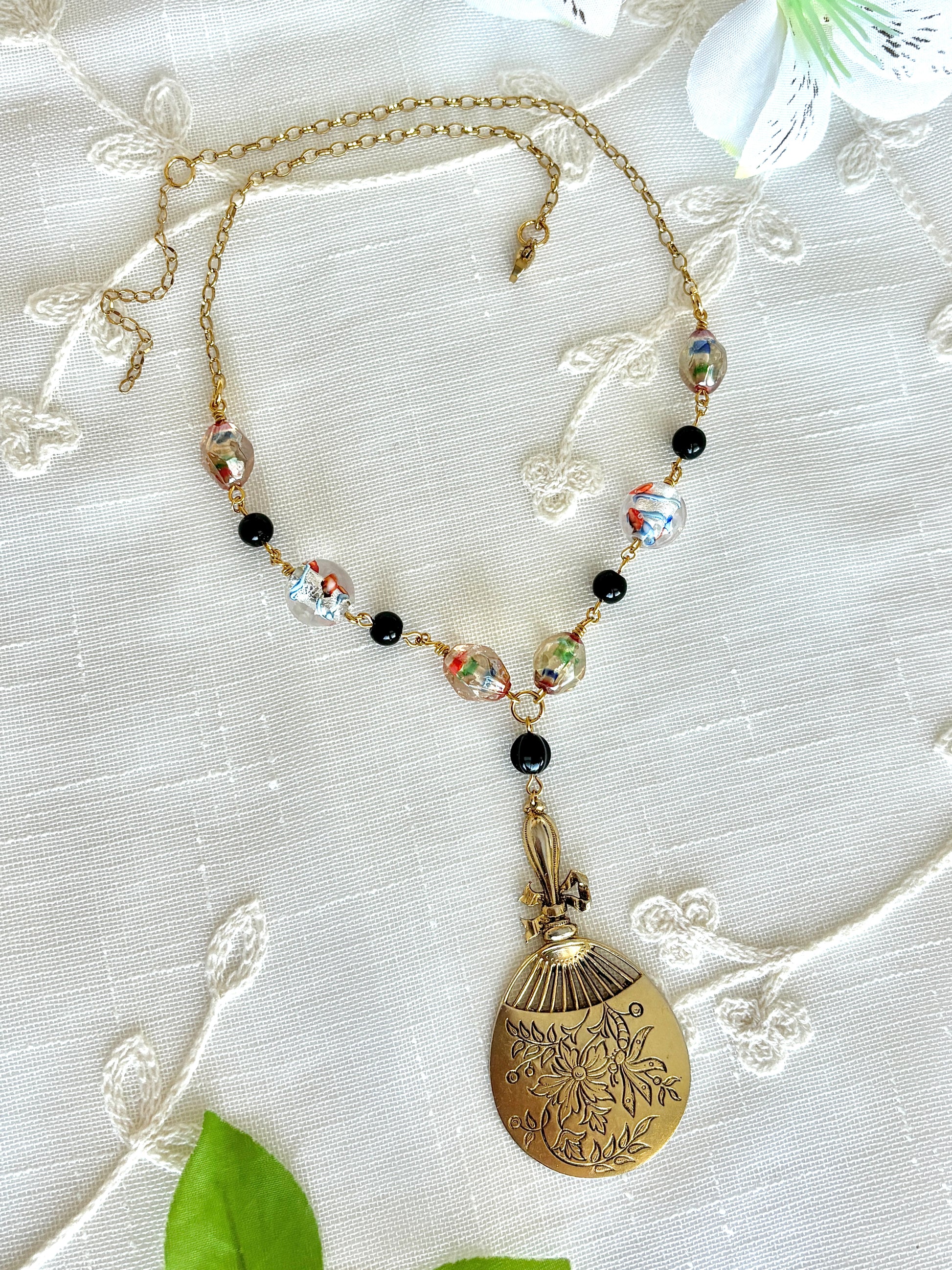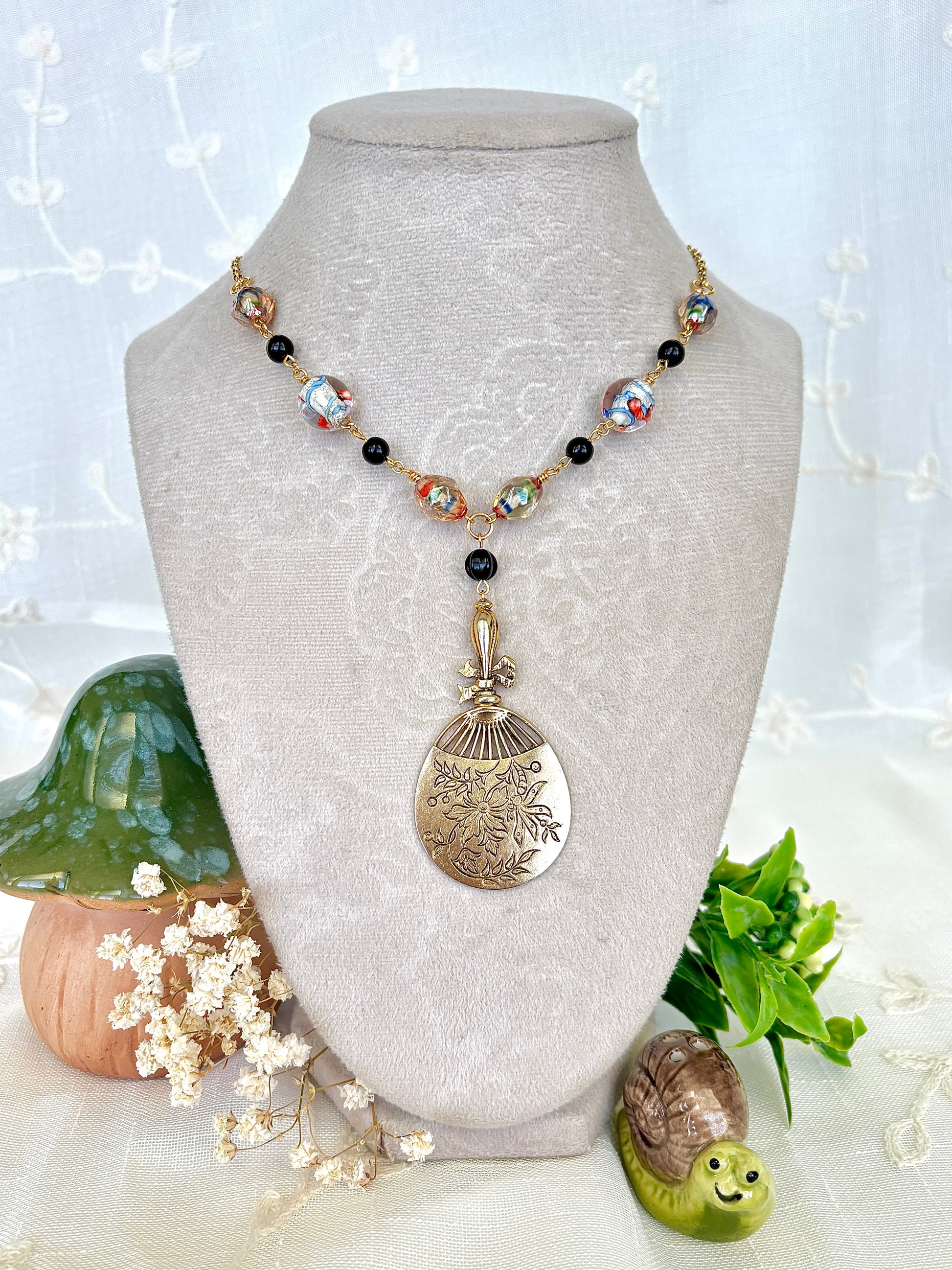 This necklace is made with an upcycled vintage fan pendant, lampwork glass beads, black glass beads, and gold plated stainless steel hardware
