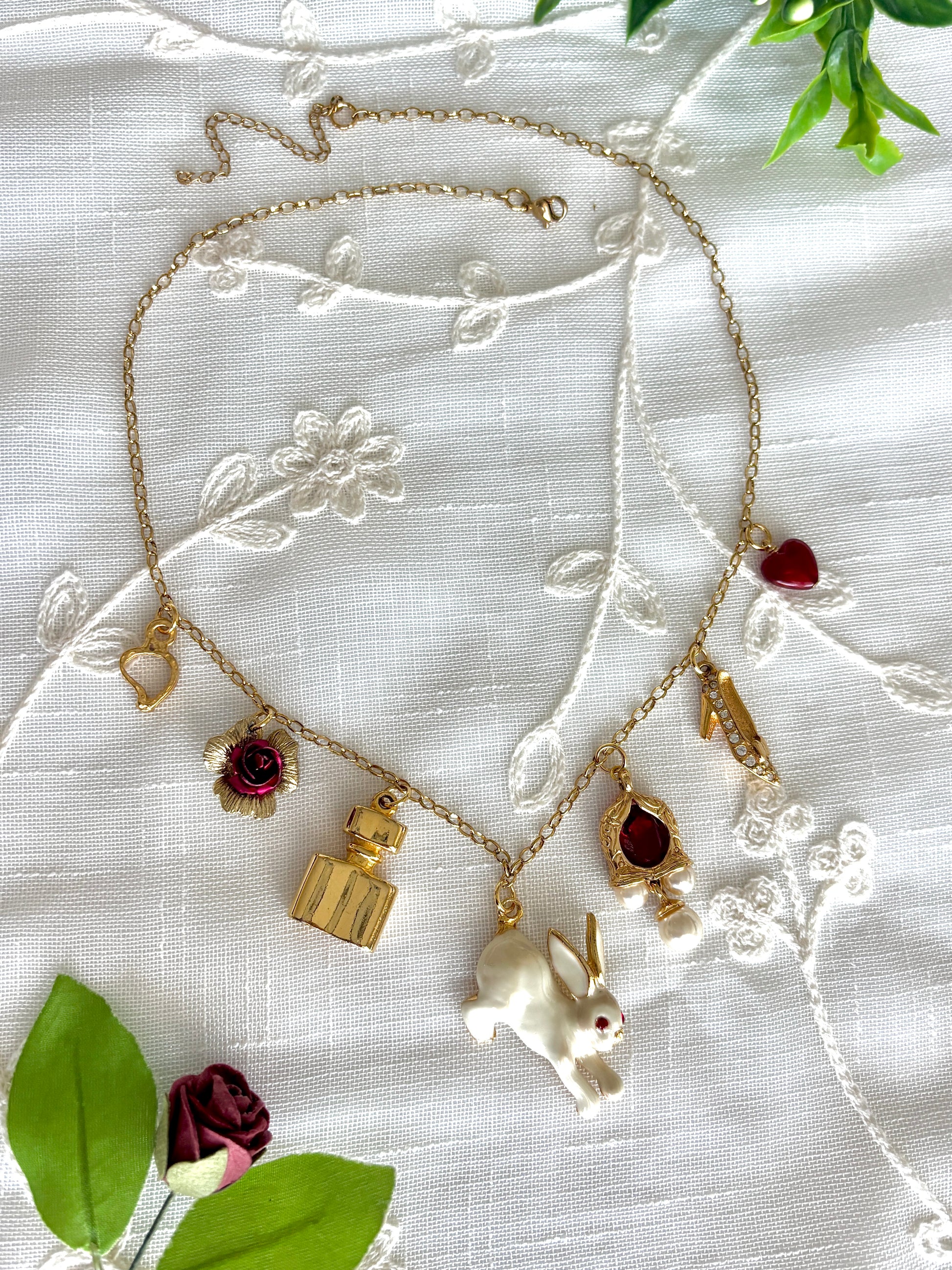 This necklace is made with an upcycled vintage Phister signed enamel bunny pendant, gold tone faux pearl and faux ruby rhinestone vintage Avon earring charm, gold tone rhinestone shoe and perfume charms, resin heart charm, gold tone vintage rose bud charm, 18k gold plated stainless steel chain, and gold tone and 18k gold plated stainless steel hardware