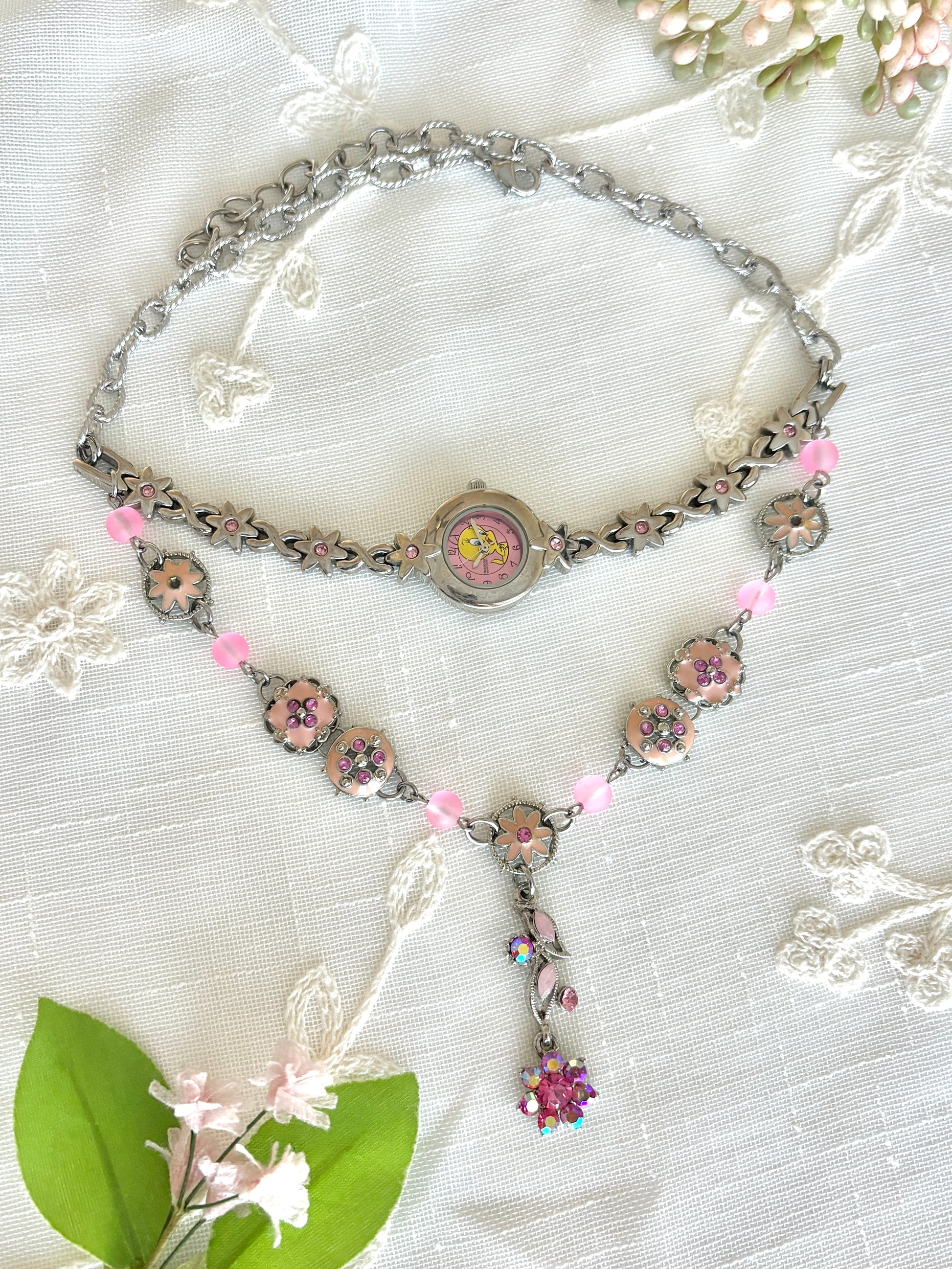 This necklace is made with an upcycled Tweety graphic face Armitron watch with a flower motif and pink rhinestone band, silver tone enamel pink rhinestone connectors, rhinestone flower charms, pink frosted glass beads, and stainless steel hardware