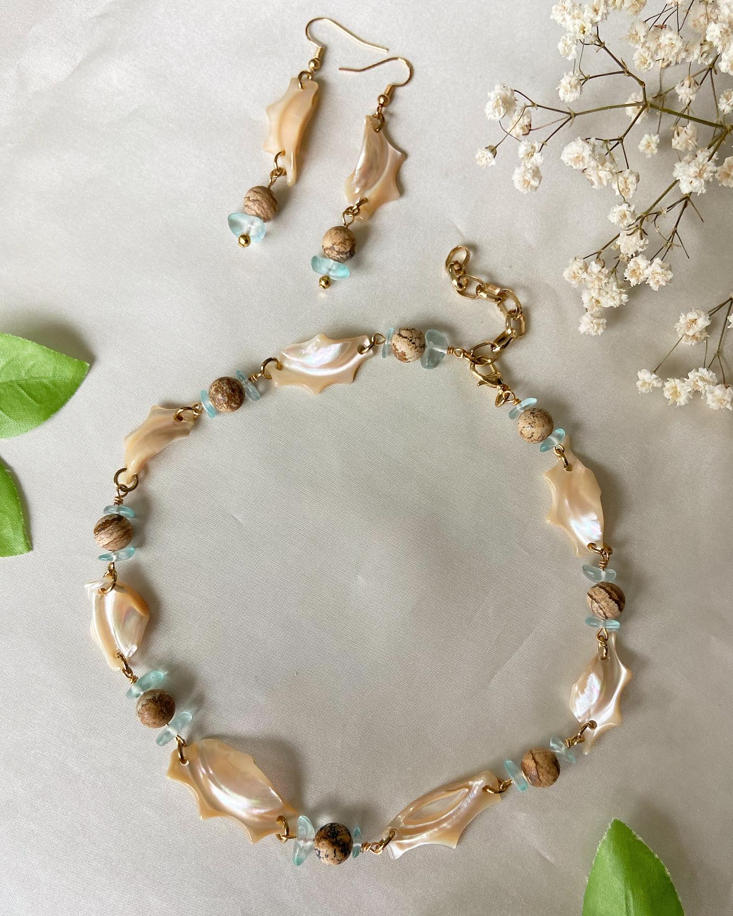 This matching set is made with large natural shell chip beads, matte Jasper stone beads, glass chip beads, and 14k gold plated hardware