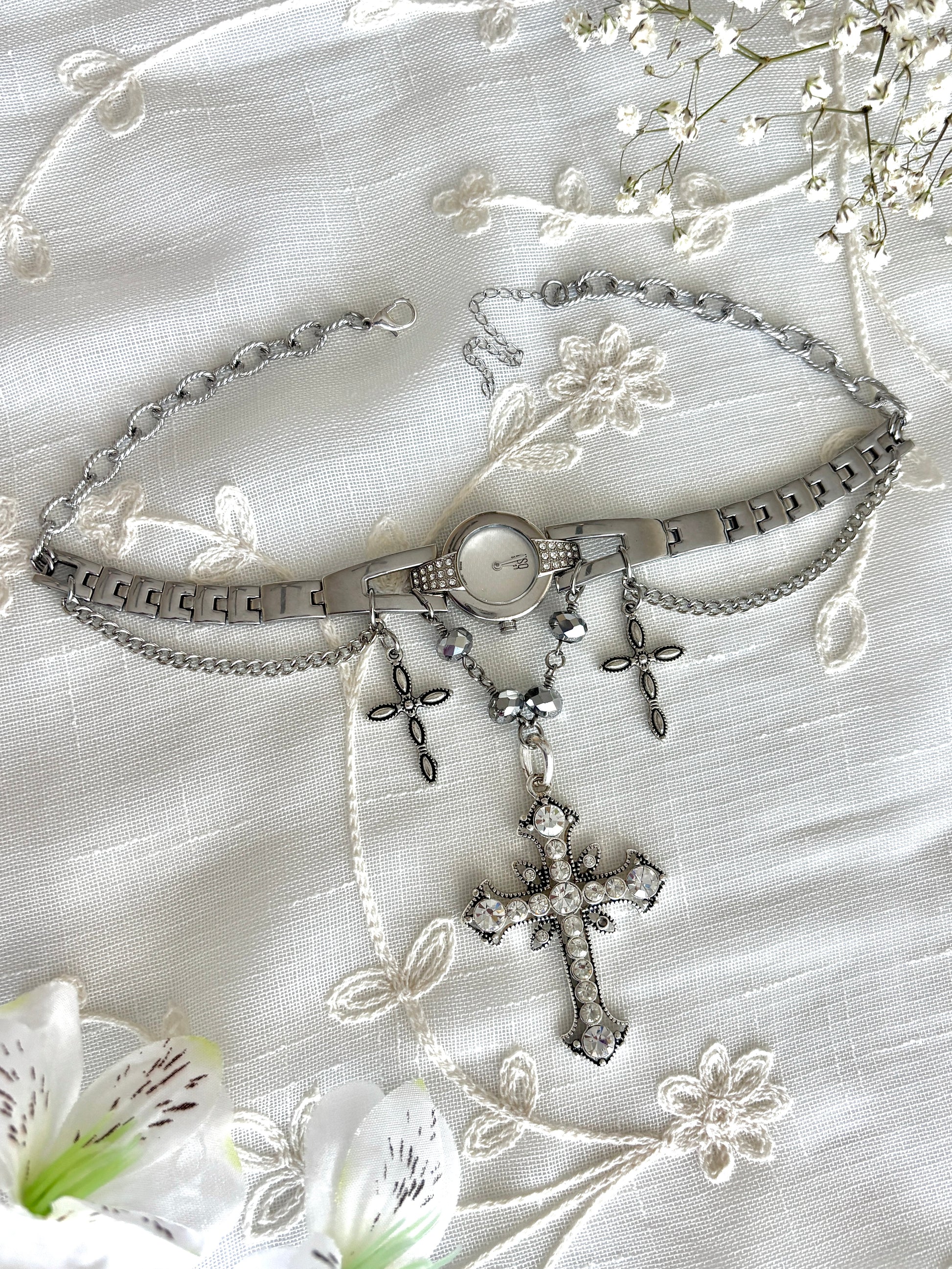 This necklace is made with an upcycled ESQ Swiss watch, rhinestone silver tone cross pendant, pewter cross charms, chrome czech glass beads, and stainless steel and silver tone chain and hardware