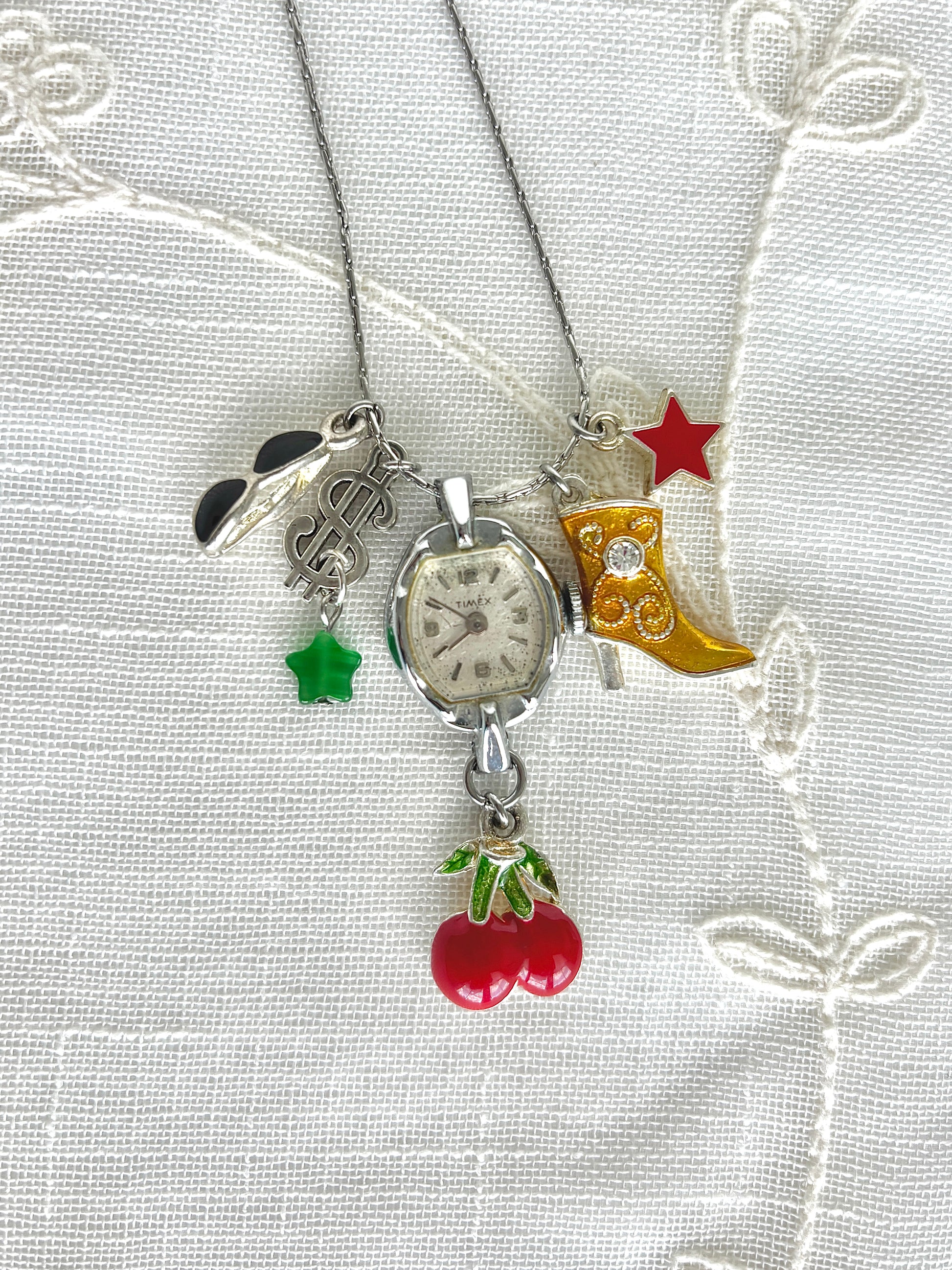 This necklace is made with an upcycled vintage Timex watch head, silver tone enamel charms, green glass star charm, and stainless steel hardware and chain
