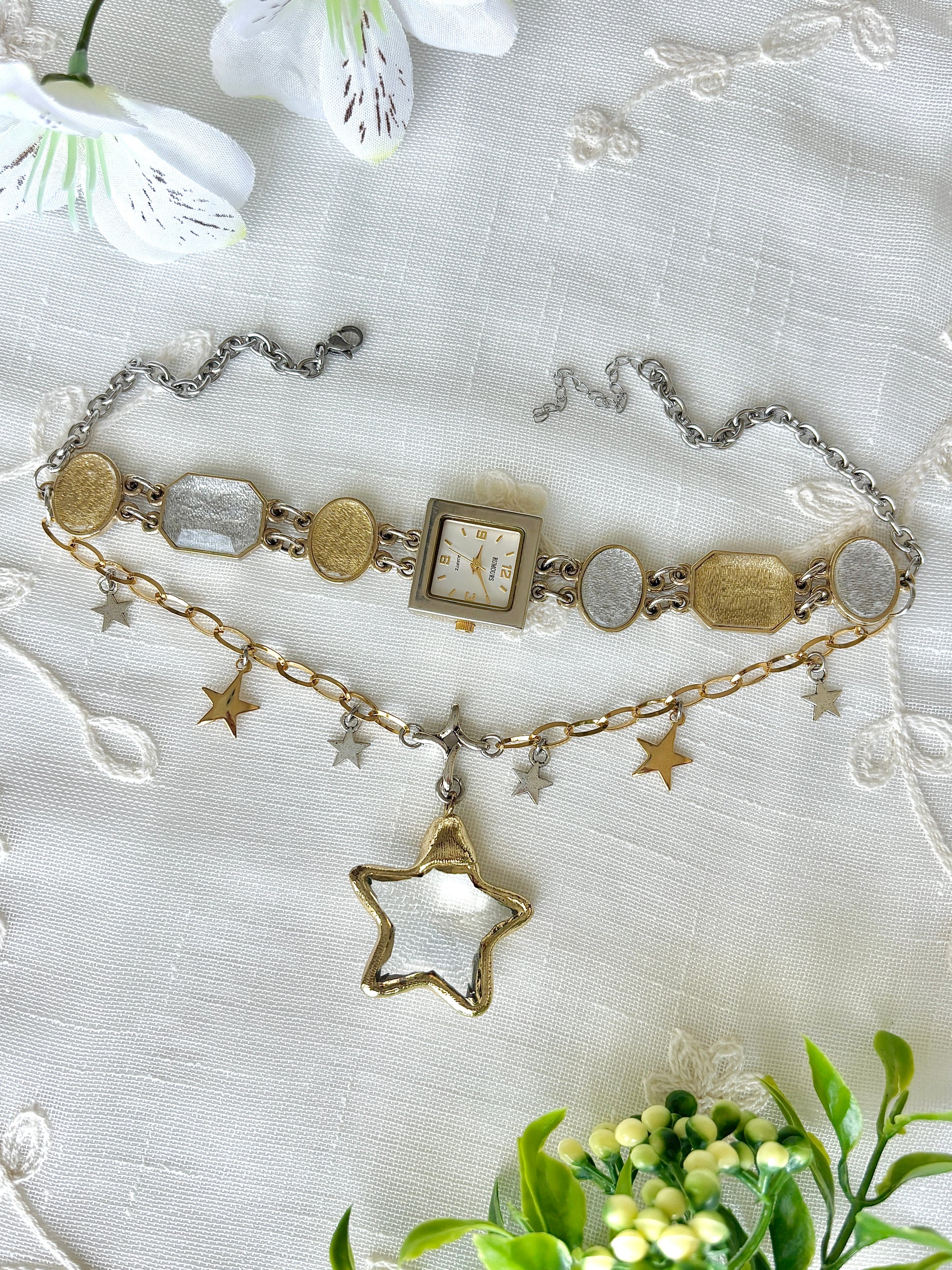 This necklace is made with an upcycled Rumours mixed metal faux gemstone watch, gold and silver tone star charms, acrylic star pendant, pewter star connector, and stainless steel chain and hardware