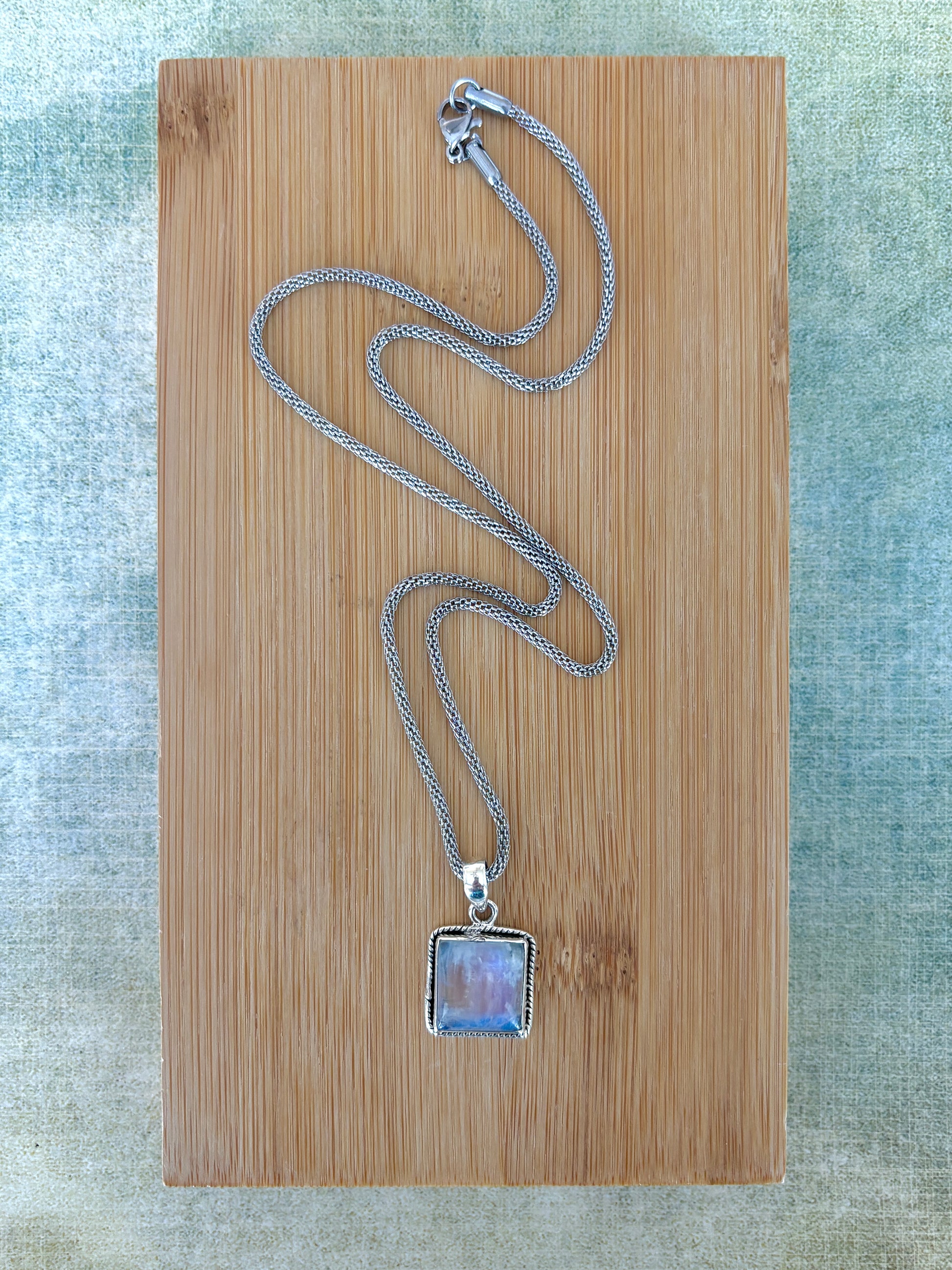 This Square Moonstone is embedded in sterling .925 silver and strung on a stainless steel chain