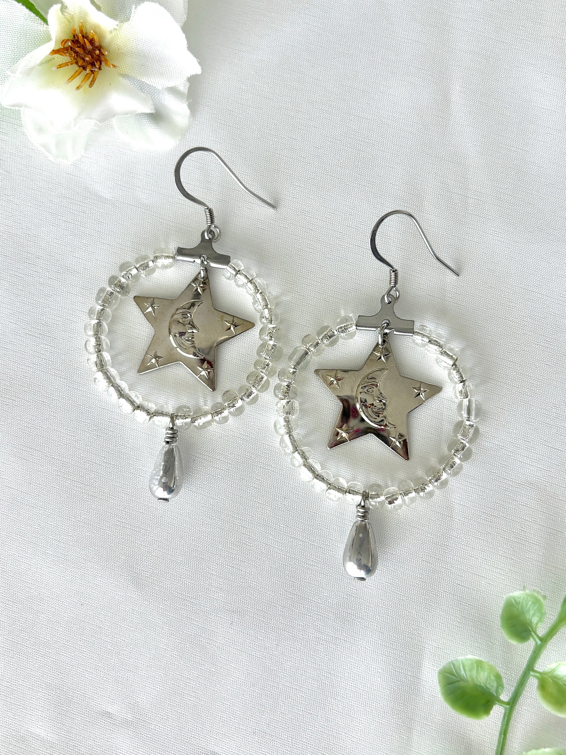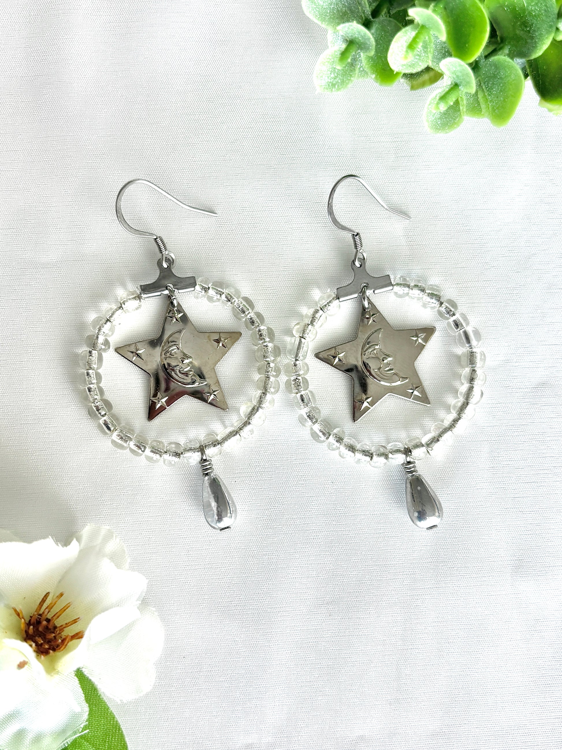These earrings are made with upcycled moon star charms, glass seed beads, glass drop beads, and stainless steel hardware and earring wire