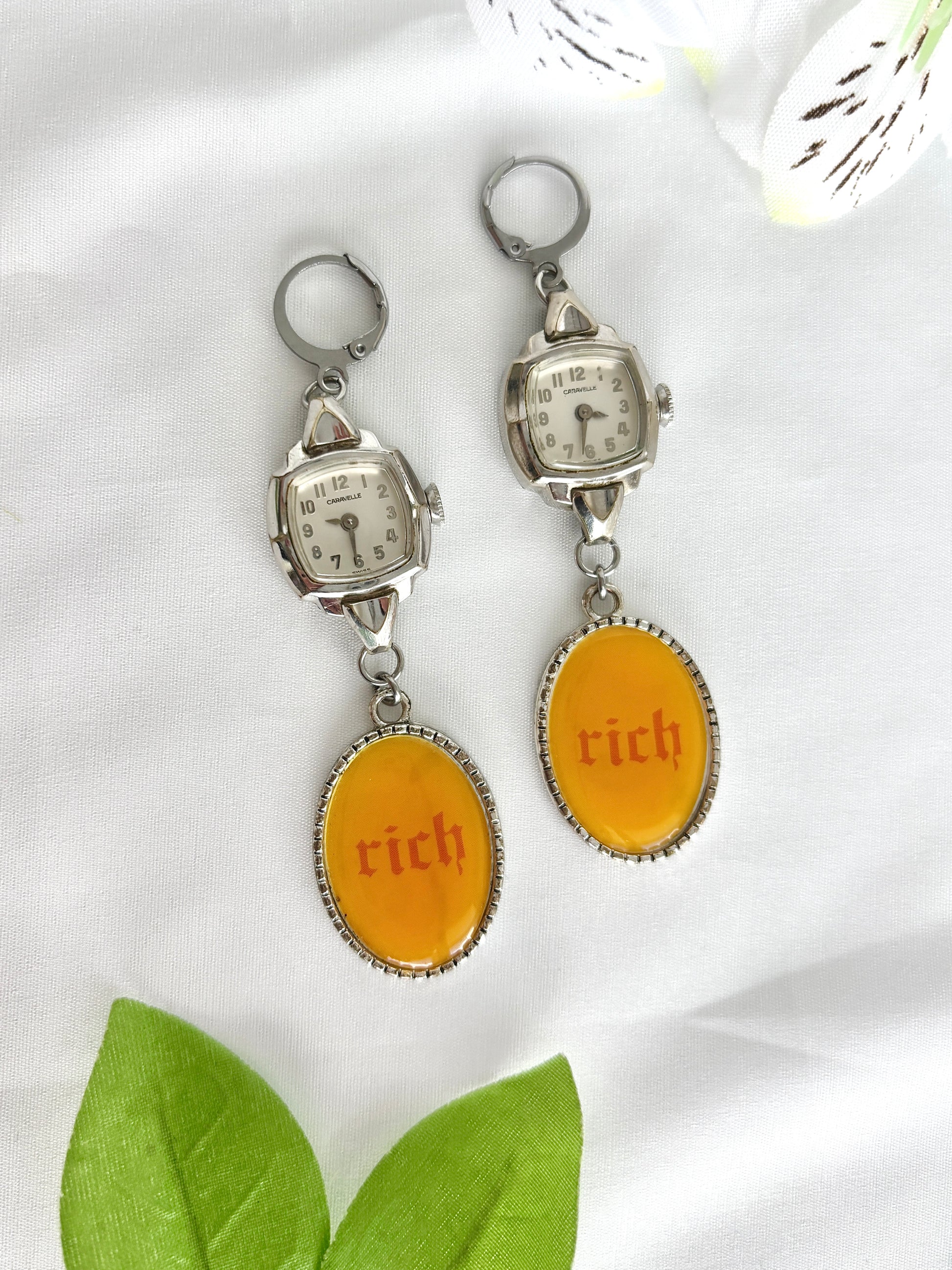 These earrings are made with upcycled vintage Caravelle watch heads, vintage AAI enamel charms, stainless steel hardware, and stainless steel huggie hoop earrings